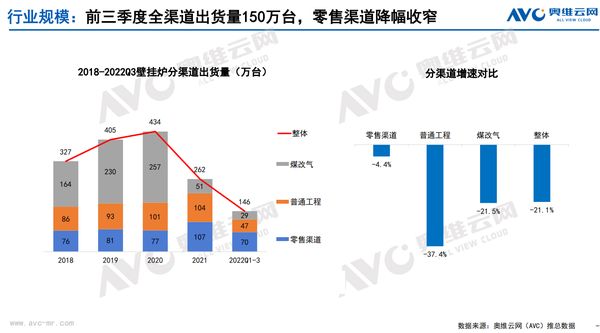 行业整体及市场需求不好的情况,需要企业更快地动作反应,而在“煤改气”项目大幅减少后,不少品牌将目光转至零售市场,使该市场表现好于大盘。奥维云网(AVC)数据显示,2022年前三季度上半年,整体渠道增速下滑21.1%,零售渠道增速下滑4.4%,工程渠道下滑37.4%,煤改气工程下滑21.5%,零售渠道是表现相对最好,同比降幅也远低于整体。