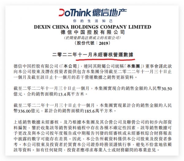 而2022年前11个月,德信中国实现累计合约销售金额约336亿元,同比下降50.67%;累计合约销售面积约185.6万平方米,同比下降42.28%。