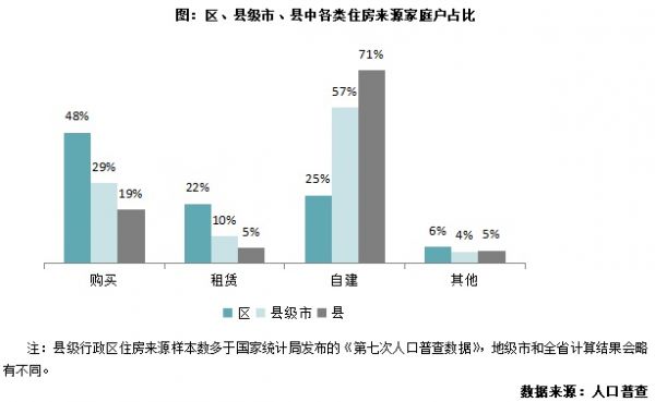 就县级行政区角度来看住房来源分化情况,市辖区中租赁户占比最高,平均达到了22%,县级市只有10%,而县更是只有5%。相对而言,市辖区流动人口规模更大,其租赁户占比自然也水涨船高。据县级行政区统计数据计算,全国74%的租赁户居住在市辖区,与本章第二节78%的跨市流动人口居住在市辖区对比来看,二者分布情况也大致相符。
