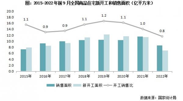 销售规模的大幅下滑,也对新房供给侧信心带来了明显的负面影响,2022年前三季度,全国商品住宅新开工面积仅为6.9亿平方米,同比减少39%,下降至2010年来的历史新低,回到2008年时的水平。而开工销售比更是降至0.8,企业新增供应意愿显著下降,预计全年住宅新开工面积降跌至10亿平方米以下。