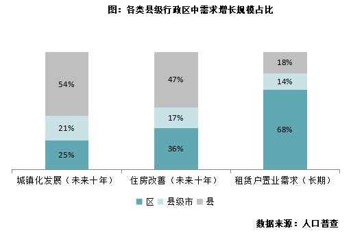 结合本章分析结论,对比未来十年县级行政区需求发展结构来看,在城镇化发展方面,由于绝大多数新增城镇人口将来自于县域地区,与之相关的住房需求增量也主要来自于县域地区。结合各地人均住房面积推算,在由城镇化发展带来的住房需求增长中,将有75%来自于县域地区,其中三线县域增量占全国的比例即达到了68%,至于积聚了全国22%常住人口的一二线市辖区,由于城镇化水平已经达到较高水平,未来十年增量空间相对有限,与之相关的需求增长只占到全国增量的11%左右。
