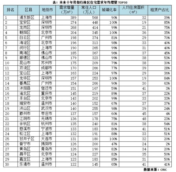 进一步细分到区县尺度,排名前列的区县主要是经济强市的近郊,TOP5更是全部自于一线城市,其中深圳两席,北上广各占一个席位,其中上海浦东以年均390万平方米的需求增量领跑,深圳的宝安和龙岗则以2500万平方米以上的规模形成第二梯队,也遥遥领先于其他区县。TOP30区县共性特征主要有四点,其一是城镇化率水平较高,如TOP10城镇化率均达到八成或更高;其二是常住人口规模较大,多在200万以上,其中上海浦东、深圳宝安、龙岗更是达到了400万人以上;其三是改善需求增长空间较大,人均住房面积水平较低,平均只有34平方米,远低于全国各区县41平方米的平均水平;其四是租赁户占比较高,“存量”刚需规模同样处于高位,流动人口的集聚带来了大量租赁人口,平均租赁户占比高达40%,远高于14%的全国平均水平,其中深圳宝安、龙岗、龙华,广州白云等市辖区租赁户占比更是超过了70%。