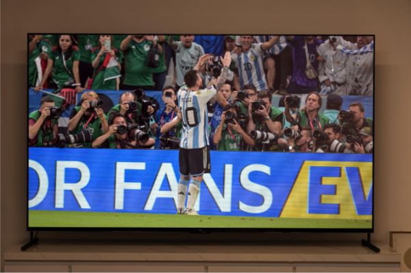 可能会有人觉得,至于吗?这就要换电视了?怎么说呢,主要这个电视的画质真的打到了我心坎上。就说之前阿根廷的比赛吧,梅西在场边和球迷互动的时候,几种不同的蓝色都能够保持自身的颜色效果,没有出现偏色、泛白的问题,原因自然是最xian进的Mini LED技术,1200nits的峰值亮度、16000000:1的动态对比度,以及98%DCI-P3的超高色域。