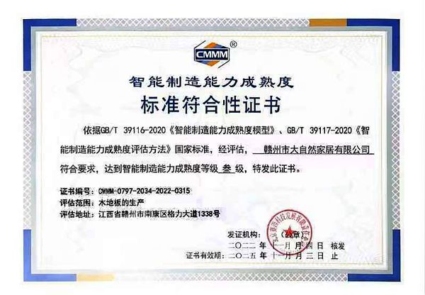 日前,大自然家居南康工厂获得智能制造能力成熟度标准符合性证书,评估专家表示,该工厂是行业首家达到该标准成熟度三级的企业,标志着大自然家居已进入工业4.0阶段,成为行业标杆。