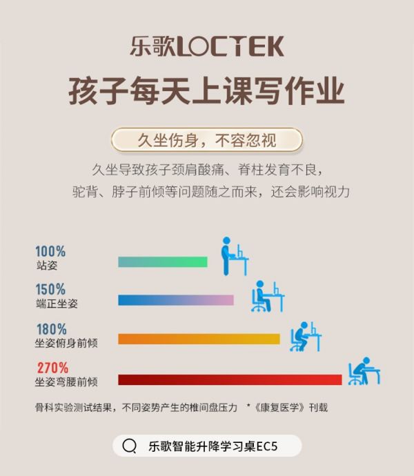在一次调研中,测试人员以直立为基础(100%)测试处于不同姿势下的受压情况,结果显示平卧为25%,侧卧为75%,直坐为140%,而前倾坐为185%,前倾加旋转则高达400%。这表明脊柱在承压较高的情况下,再加上躯干的扭转、弯曲动作,极易导致脊柱弯曲、错位。乐歌将智能升降学习桌和护脊学习椅做组合式升降桌椅组合,发挥1+1>2的效果,更高效地提供脊椎呵护支持,为儿童脊柱健康提供更科学的解决方案,从感性与理性两方面吸引潜在受众。