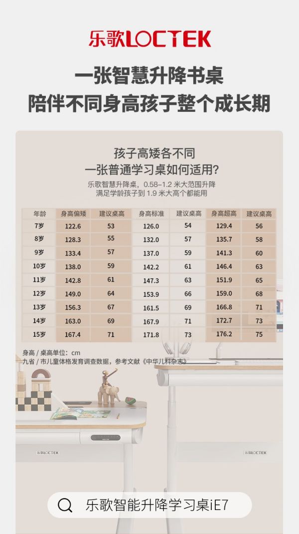 可实时调节书桌高度拥有较大升降区间范围等优势的一张智能学习桌则很好地解决了家长们的困扰,例如乐歌iE7智能升降学习桌可在58-120CM的区间进行升降调节,从4岁低龄儿童到身高180的高中生都能适用,让一张智能升降学习桌从小用到大,将科学性、经济性与升降学习桌的使用场景深度关联,快速占领用户心智。