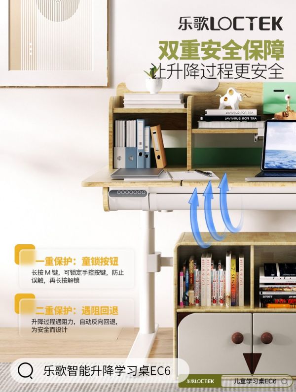 其实,乐歌也远比想象中更懂家长朋友们的担忧,深知保证孩子日常使用安全也是一项非常重要的事情,以iE7智能升降学习桌为例,内置安全遇阻回退功能,当升降过程中遇到阻力时会自动启动反向回弹机制,可以有效防止孩子意外磕碰和桌下物品撞击,同时也配备了童锁,最大程度保障孩子们的使用安全。
