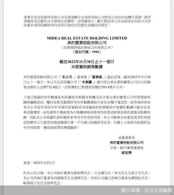 受宠于政策面却失宠了市场面。2018年登陆港交所,2019年迈入千亿阵营的美的置业,今年前11月,美的置业实现合同销售金额约732.4亿元,同比减少42.52%,较1400亿的销售目标仅完成约52.3%。距离年关不足半个月,今年美的置业大概率将暂别“千亿阵营”。