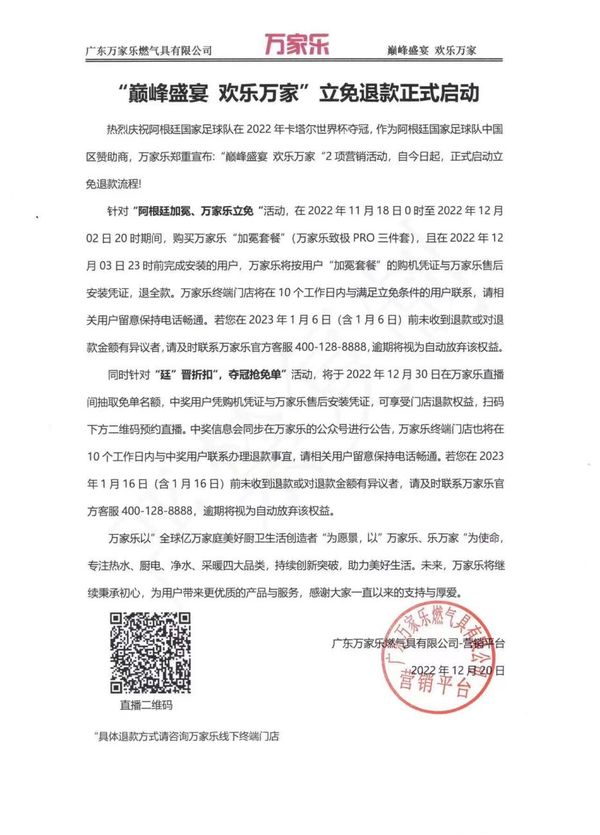 根据万家乐发布的公告显示,万家乐“巅峰盛宴、欢乐万家”2项营销活动,自今日起,正式启动立免退款流程。