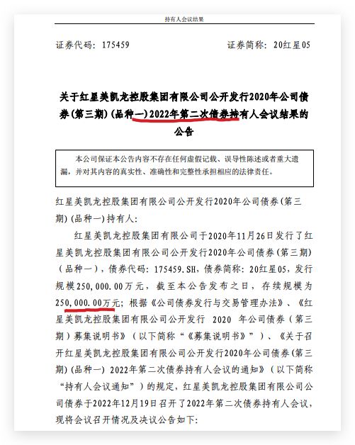 公告披露,红星美凯龙控股集团有限公司公开发行2020年公司债券(第三期)(品种一)债券简称“20红星05”(债券代码:175459),发行规模25亿元,期限3年,当期票面利率6.88%。于2022年12月19日召开了2022年第二次债券持有人会议。