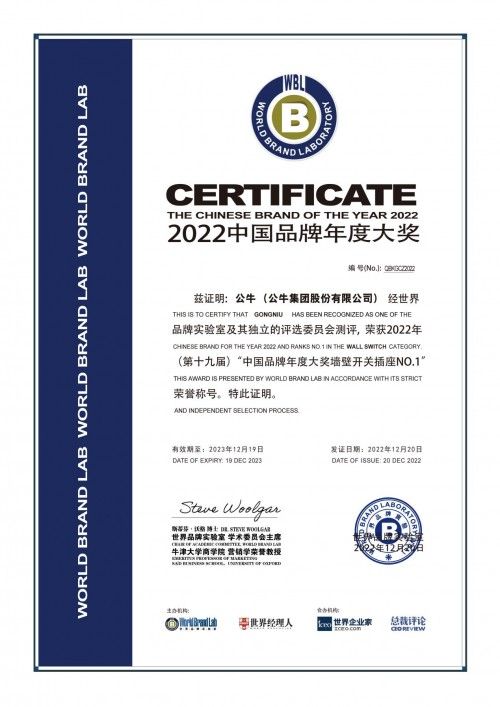 作为“中国品牌奥斯卡”,“中国品牌年度大奖”由全球领先的品牌价值评估机构——世界品牌实验室评定,经100多个行业、近3000个品牌激烈角逐,共35个活跃在中国经济舞台的国内外领军品牌入选。登顶榜单,可以说是对公牛墙壁开关行业地位、市场口碑、专业实力的高度认可。
