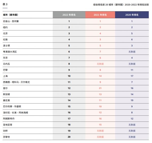 《国际科技创新中心指数2022》通过科学中心、创新高地、创新生态3个维度的31项指标,对全球100个城市(都市圈)的创新能力进行评价,反映世界创新版图变化趋势以及国内重要城市的创新表现。评估显示,旧金山-圣何塞排名第一,实现三连冠,纽约蝉联第二,北京超越伦敦位列第三。亚洲城市在绿色低碳发展领域表现突出,在可再生能源技术专利上具有显著优势。