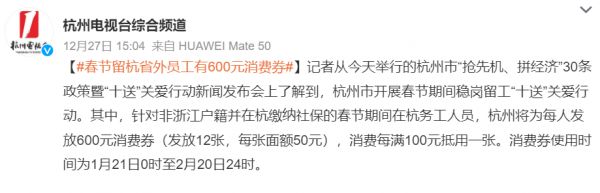 据悉,为鼓励和倡导省外员工春节期间留杭稳岗,助力企业复工达产,杭州将向每名春节期间留杭的省外员工(在杭缴纳社保的非浙江户籍员工)发放600元消费券(发放12张,每张面额50元),消费每满100元抵用一张。消费券使用时间为1月21日0时至2月20日24时。