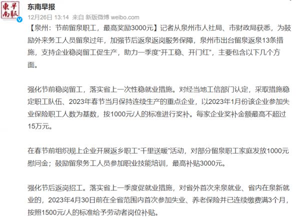 12月26日,福建泉州也出台措施,支持企业稳岗留工促生产,节前留泉职工,最高奖励3000元: