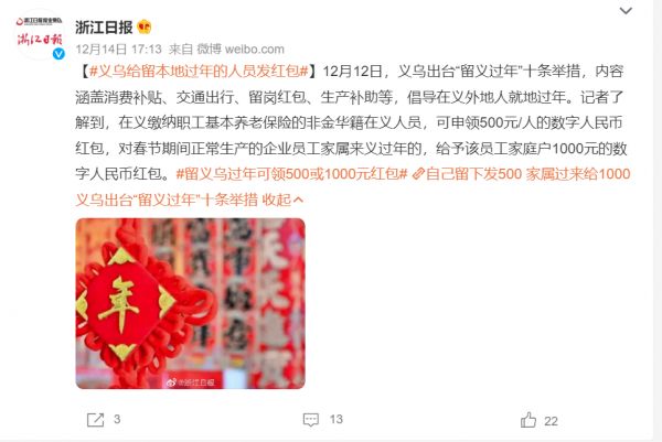 12月12日,义乌出台“留义过年”十条举措,内容涵盖消费补贴、交通出行、留岗红包、生产补助等,倡导在义外地人就地过年。记者了解到,在义缴纳职工基本养老保险的非金华籍在义人员,可申领500元/人的数字人民币红包,对春节期间正常生产的企业员工家属来义过年的,给予该员工家庭户1000元的数字人民币红包。