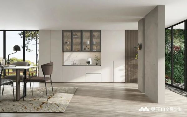 吊柜宽边玻璃门与轻薄玻璃层板形成对比