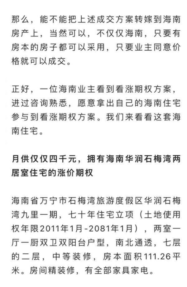和上文青年路小区的操作一样,此人表示,海南省万宁市石梅湾旅游度假区华润石梅湾九里一期某房源“可以总价220万元整体购买,也可以单独购买20年的看涨期权,仅仅每月月供4000元,买断房价上涨收益的80%获利权。”