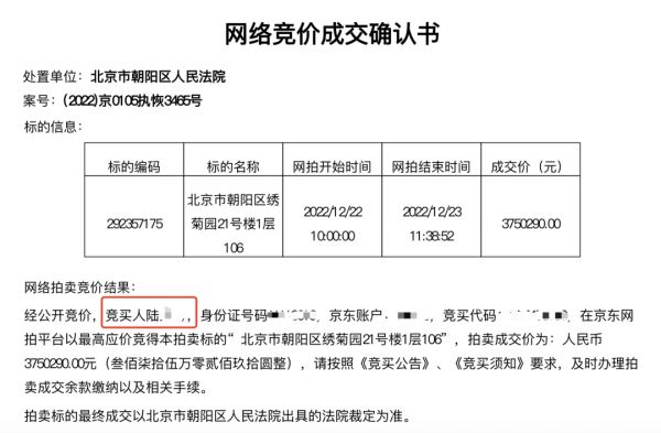 2022年12月23日,北京市朝阳区绣菊园21号楼1层106室的一套房源完成了司法拍卖,根据成交确认书,陆某以375万元拍得。