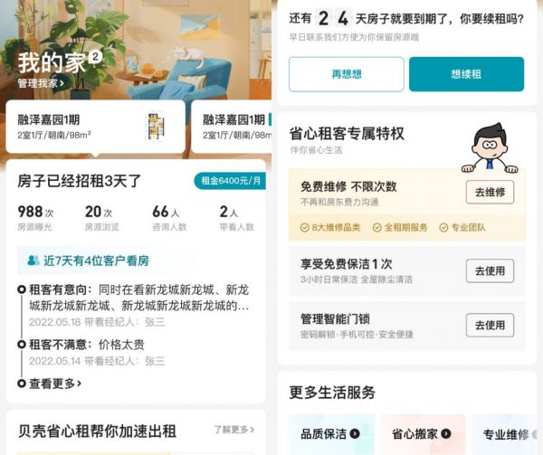 值得关注的是,为方便业主查询服务进程,“我家”页面升级还强化了线上服务流程展示,支持交易、出租、出售、装修服务进度可视化查询。具体来说,对于购房中业主,支持查看房屋交易的过户、贷款等进度;对于装修中业主,支持查看装修每日进度、竣工档案及联系售后;对于租客、出租中业主,支持查看租期、合同、物品交割明细、省心租权益等。