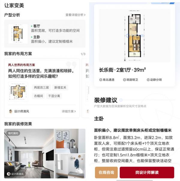 同样,新版本还特别突出了贝壳的特色服务。比如,聚焦在卖房、出租的“资产管理”模块,不仅提供了资产报盘与估价服务,还可以直接找到专业的服务者。同样,聚焦在家装、家居的“让家变美”模块,不仅可以根据房产实际情况为用户提供专属户型解析和装修参考方案,还可以提供家装设计师咨询。