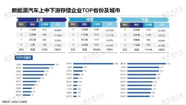 这些领域,长三角和珠三角地区仍然占据绝对优势。根据城市进化论联合启信宝发布的《2022全国新能源汽车产业区域研究报告》,在新能源汽车产业链下游,郑州、合肥、西安等企业数量均已跻身前十,但上游和中游前十阵营依然被长三角和珠三角城市占据。