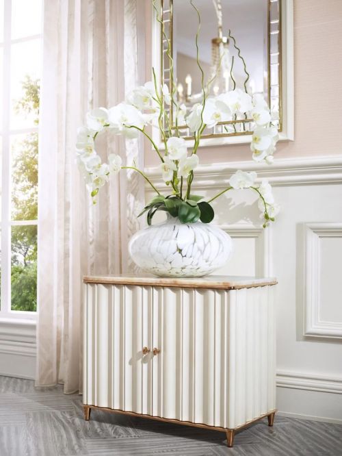 美丽的鲜花有吉祥美好之意,新年将至,越来越多的屋主选择购买“年花”为家里增添节日气氛。蝴蝶兰寓意幸福美满,一直是年宵花当中的首选,白色蝴蝶兰最为纯净,置于奶油玄关柜上,衬托家居明亮的同时,温柔又不失优雅。