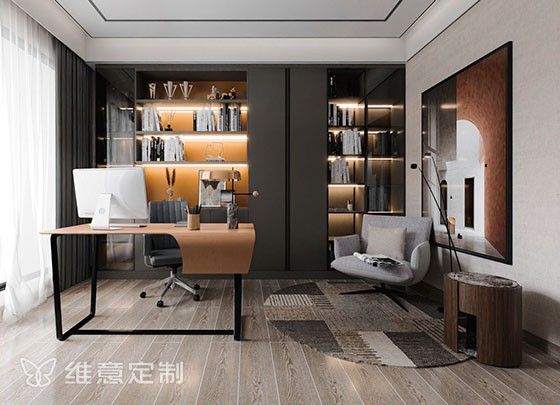 皮革书桌橙色台面与柜体呼应,营造轻奢;整面书柜满足收纳、展示、书籍摆放需求。