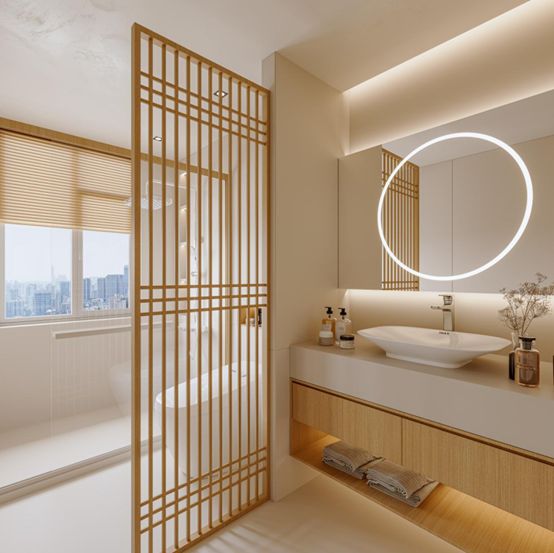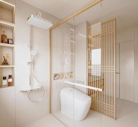 使用原木色+奶白色配色,让本该狭小的空间看起来更加明亮开阔:原木色镂空隔断,保证采光,增加日式氛围;线条柔和的白色系产品,让空间通透柔和。悬空台盆让日常打理更加方便,壁龛则解锁更多储物空间。