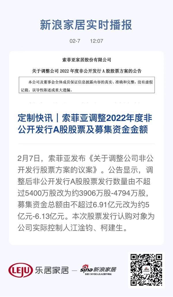 定制快讯|索菲亚调整2022年度非公开发行A股股票及募集资金金额