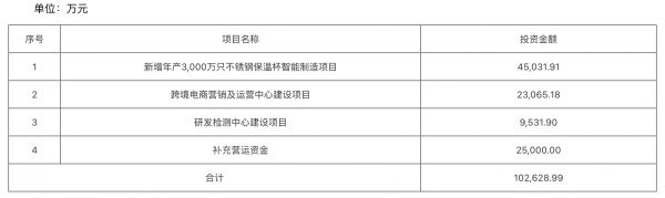 同富股份IPO本次拟公开发行股票总数量不超过3,402万股,且不低于本次发行后公司总股本的25%,拟于上交所主板上市,保荐机构为光大证券。公司本次发行所得募集资金主要用于新增年产3,000万只不锈钢保温杯智能制造项目、跨境电商营销及运营中心建设项目、研发检测中心建设项目和补充营运资金。