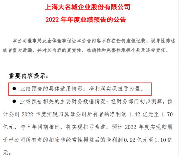 1月30日,大名城(600094)(SH600094,股价3.30元,市值81.69亿元)发布业绩预告,预计在2022年度将实现扭亏为盈,归母净利润为1.42亿-1.7亿元。
