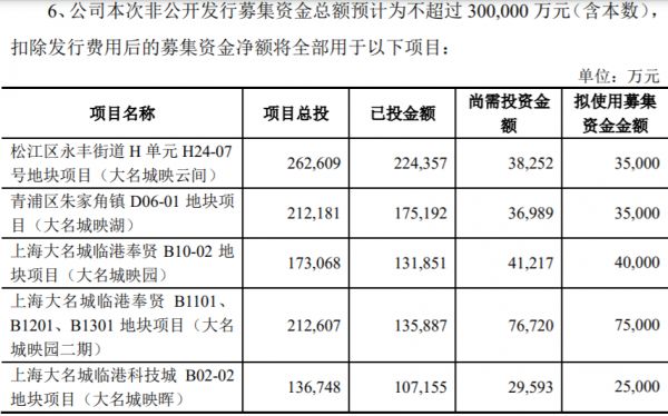 据介绍,松江区永丰街道H单元H24-07号地块项目(即大名城映云间)于2020年9月开工建设,预计于2023年3月交付。项目计划总投资26.26亿元,尚需投入3.83亿元,拟使用募集资金3.5亿元投入该项目。