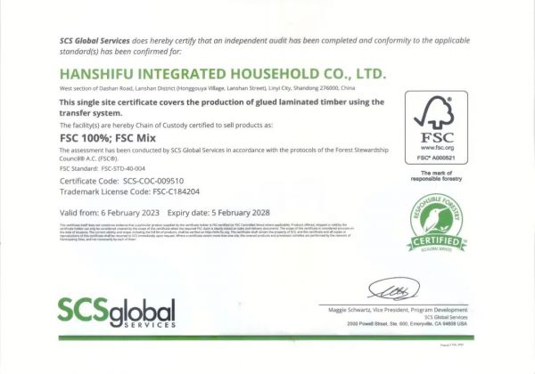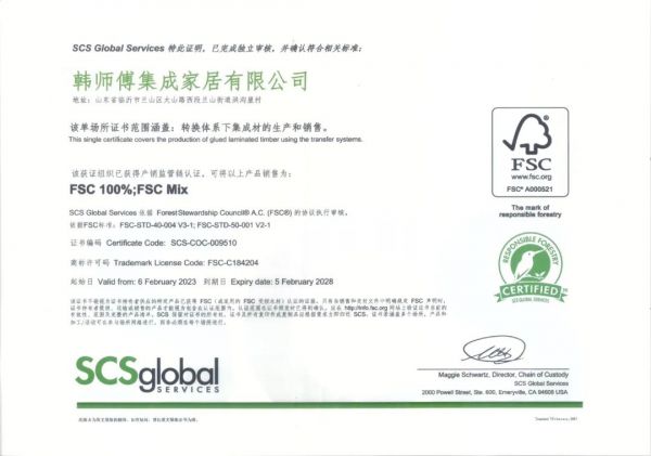 凭借韩师傅对绿色环保理念的不断坚持,韩师傅顺利通过了一项国际权威认证——FSC 森林认证,获得FSC-COC产业监管链认证证书。支持森林资源可持续经营,为消费者提供更环保的健康家居!