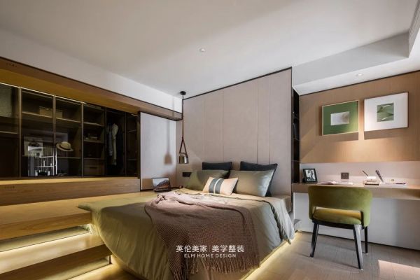 二层卧室空间极具设计感,舒适温馨的陈设让紧绷的工作压力被消解,床边的化妆区简单舒适,工作不仅需要伏案劳作,更需要停下脚步,沉淀思维的角落。