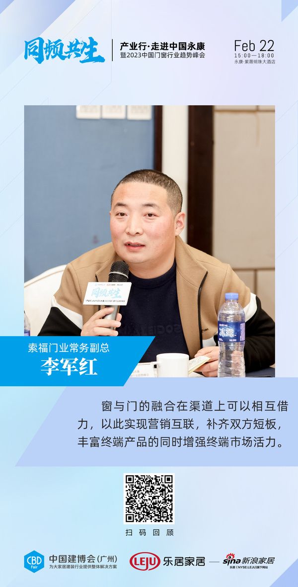 索福门业常务副总李军红:窗与门的融合在渠道上可以相互借力,以此实现营销互联,补齐双方短板,丰富终端产品的同时增强终端市场活力。