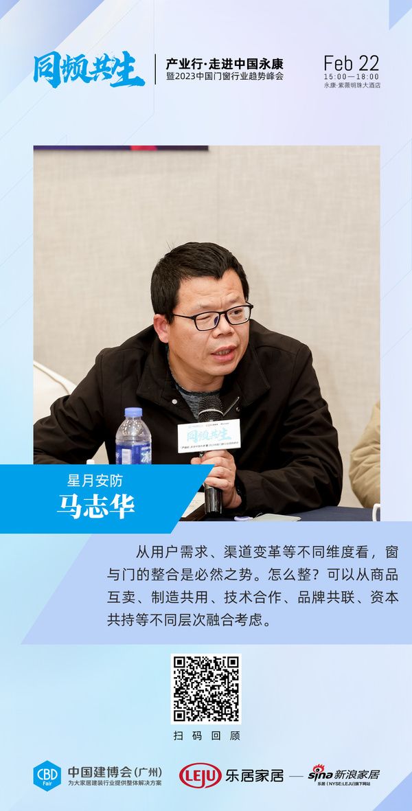 星月安防马志华:从用户需求、渠道变革等不同维度看,窗与门的整合是必然之势。怎么整?可以从商品互卖、制造共用、技术合作、品牌共联、资本共持等不同层次融合考虑。