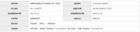 中国网财经2月24日讯 北京产权交易所最新消息显示,保利(湖南)投资有限公司挂牌转让湖南新滨湖房地产开发有限公司(下称“湖南新滨湖房地产”)51%的股权,底价2917.14万元。