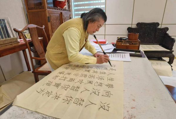 可大家觉得奇怪的是,伍炳亮这个工艺美术大师怎么又爱上了书法,并且一爱就爱得一往情深。原因恐怕正在于它们之间的相通性。线条是中国传统艺术会通的桥梁。以线条为桥通方圆,以方圆为调赋神韵。
