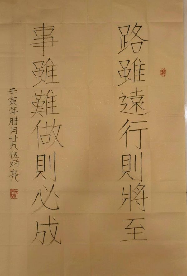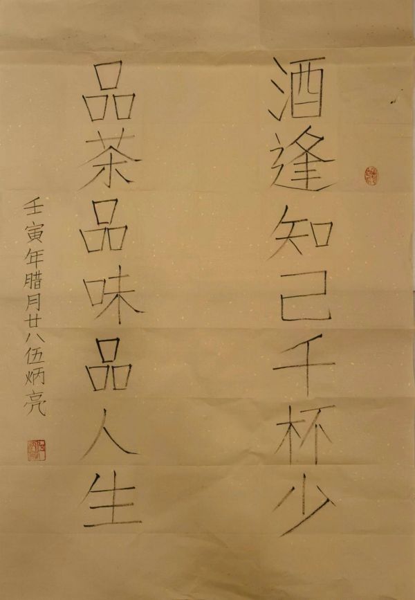 但不了解他的人,置疑或猜疑多过赞誉和崇敬。尤其是在早期,有人说的文化、有说他的性格、有说他的作品,总之,飞短流长者不在少数。最有代表性的是说他只是一个文化不高的木匠,竟然被授予中国最d级的工艺美术大师和艺术家?竟然称他的艺博馆是由他一手设计的等。殊不知,古往今来,木匠出身的大家不在少数。不说世人皆知的鲁班,与孔子齐名的墨子,也是平民木匠出身。可他既是中国古代杰出的科学家,又是著名的思想家、理论家和军事家。往近处说,连毕加索都认为是s界级艺术天才的齐白石,曾经也是一位木匠雕工,也仅仅读了几年的塾书,却成为了一代宗师,并且经常自称他的书法比他的画更好。齐白石如此为自己的字而得意满满,与伍炳亮今天为他的书法而陶醉,又是何等相似!