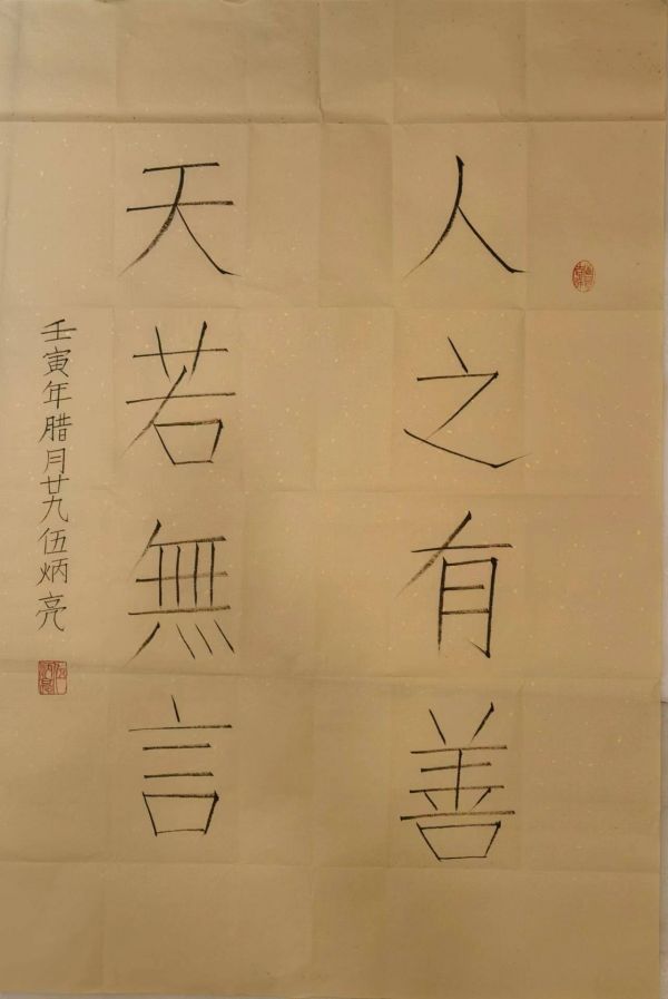 静为躁之君。热爱线条艺术都需要一股超常的静气静力。凡习书者大多会有一种体会,就是心静才能气和,气和才能手定。我早年曾两次拜访过伍炳亮先生,虽只有一面之交,但却发现他是一位不露声色、谦卑少语、涵养很深的“超静笃”之人。如同著名的美学家朱光潜所言:“”有趣的灵魂都有一股内在的静气”。与他深交的人也这么告诉过我,伍炳亮先生内心拥有一个非常有趣的灵魂。也许正是这个有趣的灵魂中的那股静气,赋予了他那个无比强大的内心和无比笃定的信仰。