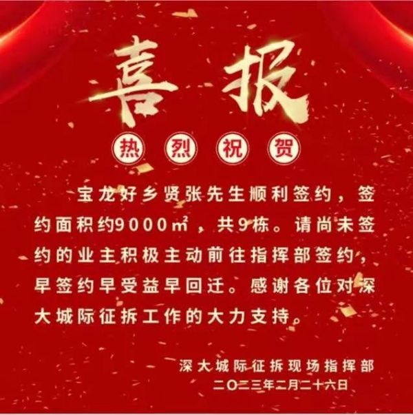 “深圳一业主签约9栋约9000平方米!来自深大城际征拆现场指挥部的祝贺!”