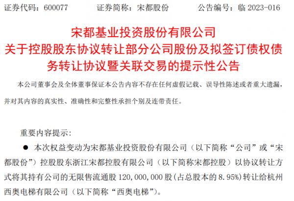 2月27日,宋都股份公告称,控股股东浙江宋都控股有限公司(以下简称宋都控股)以协议转让方式,将其持有公司的无限售流通股1.20亿股(占总股本的8.95%)转让给杭州西奥电梯有限公司(以下简称杭州西奥电梯)。经双方协商一致确定,标的股份每股转让定价为2.5元,转让价款共计3亿元。