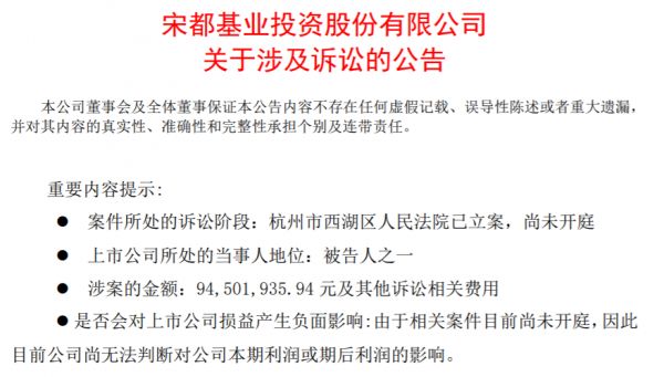 日前,宁波正起企业管理咨询合伙企业(有限合伙)(以下简称宁波正起)将宋都股份告上法庭,涉及金额约9450万元。目前杭州市西湖区人民法院已立案但尚未开庭。
