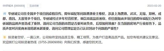 对此,华侨城A回复称:一直以来,公司始终坚持品质立身,精工细筑,为客户打造高品质产品。如有相关建议及意见,欢迎拨打公司投资者热线反馈,感谢关注。