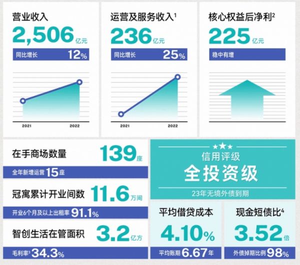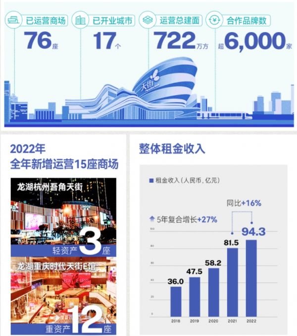 2022年,龙湖已运营商场76座,运营总建面722万方,整体租金收入达到94.3亿。