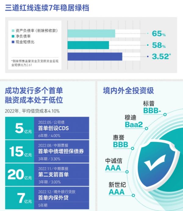 2022年,龙湖的平均借贷成本为年利率4.1%,平均贷款年限为6.67年,融资成本相对其他房企较低。