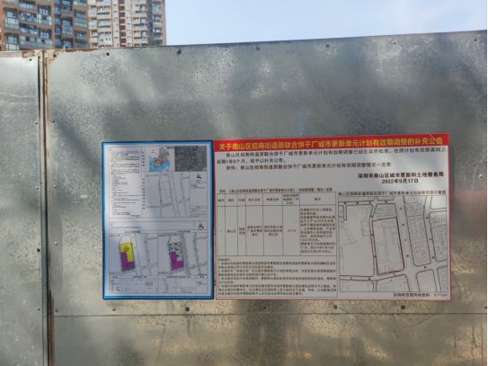 在项目入口处,张贴着一张项目获批后的补充公告,在原有效期基础上延期1年6个月,至2023年4月18日止,由南山区城市更新和土地整备局发布。在项目内部,目前该地块已完成拆迁,处于空地状态。