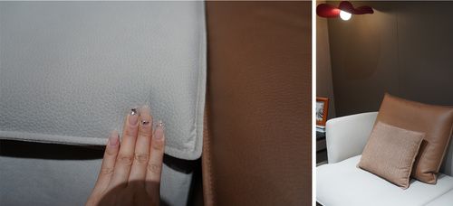 其次,新品沙发的出色还在于面料精选优质真皮,厚实耐磨,而且色牢度检测达4-5级,色泽稳定,表面轻压摔工艺,皮质纹路清晰,组织细致紧密,细腻柔软,制作工艺精细。
