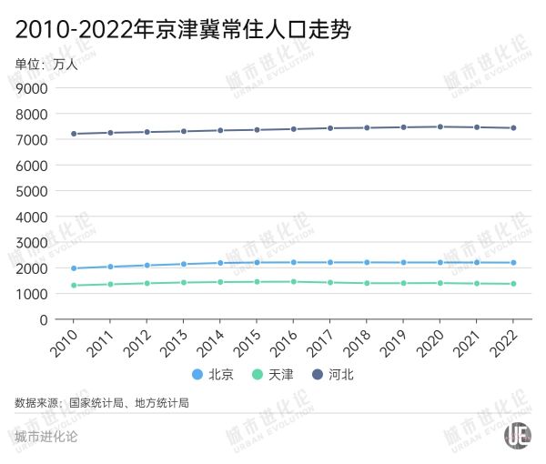 具体来看,北京已连续六年常住人口“温和”负增长,2022年人口减少最多,为4.3万人;天津则连续两年净减少人口规模在10万水平;最大的变化发生在河北身上,继2021年减少15.84万人后,2022年流失规模接近翻倍,达到28万人。
