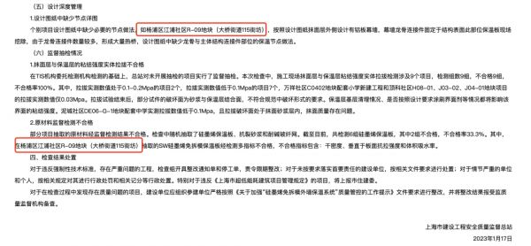 据上海市建设工程安全质量监督总站1月17日发布的《2022年度本市硅墨烯免拆除外墙保温系统质量专项检查通报》,部分项目外墙固定大量龙骨连接件形成热桥,未采取处理措施。如杨浦区江浦社区R-09地块(大桥街道115街坊)抹面层外侧设计有铝板幕墙,幕墙龙骨连接件固定于结构表面,此部位保温板现场挖除,未采取有效措施修复保温层以阻断热桥;在杨浦区江浦社区R-09地块(大桥街道115街坊)抽取的SW硅墨烯免拆模保温板经检测多指标不合格,不合格指标包含:干密度、垂直于板面抗拉强度和体积吸水率等。